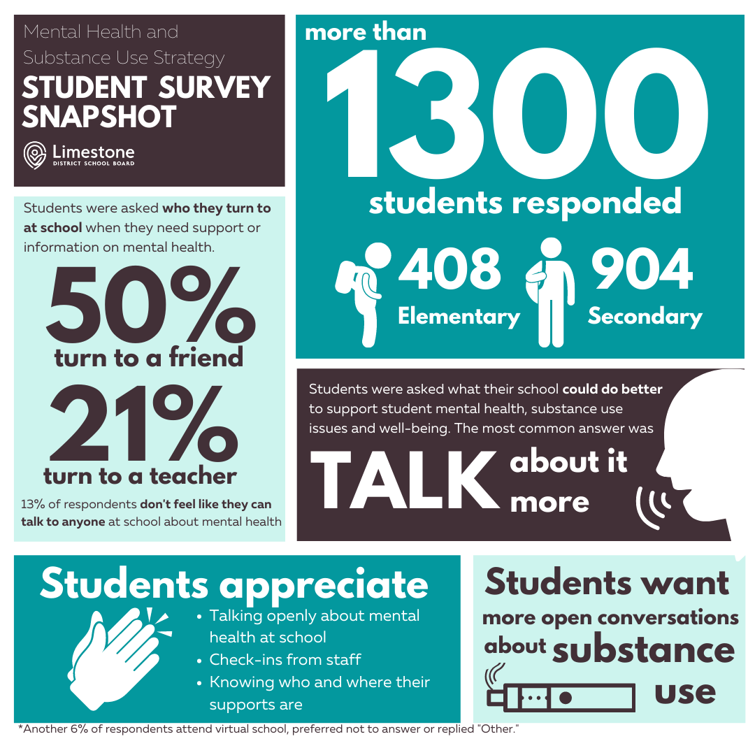 More than 1,300 students provided input into the Limestone District School Board’s recent survey to help inform its Mental Health and Substance Use Strategy.
